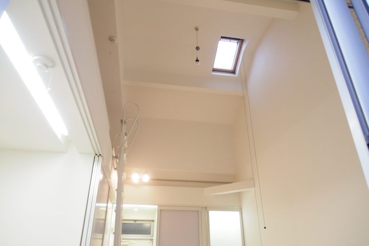 広い。そう感じたのは天井の高さからなのでしょうか。部屋全体の天井が高く、天井に付いているトップライトからは光が注ぎ込んでいました。