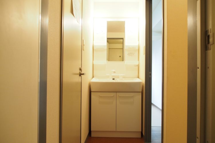 ハンドシャワー付きの独立洗面台が設置されています。収納力もたっぷり。 -