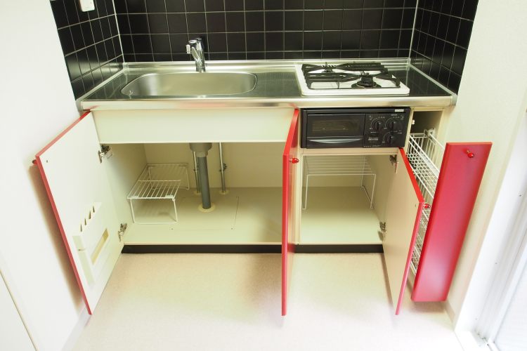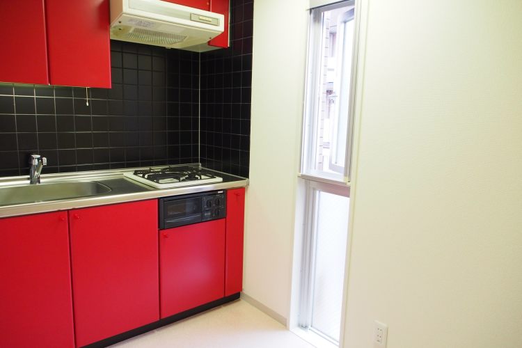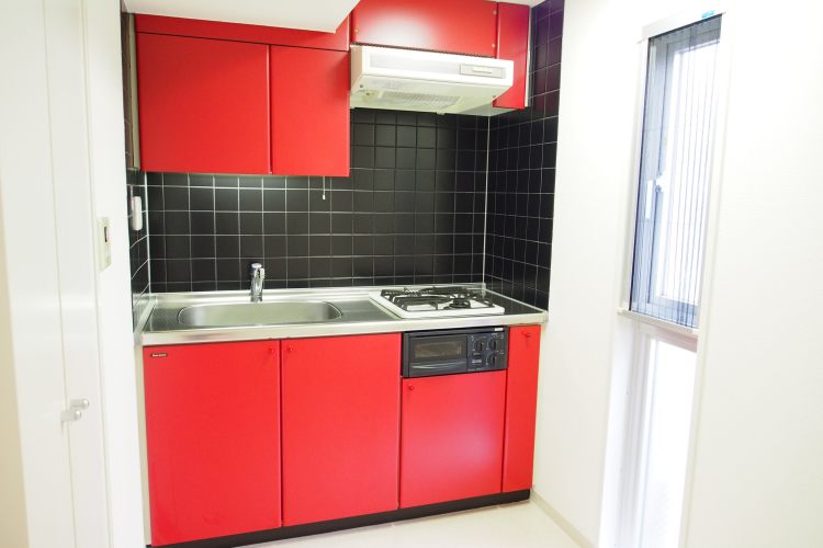 1. たっぷり収納にグリル付き、設備が充実したキッチンが備わっています。また、キッチンエリアが広めに区分けされているのも嬉しいポイントです。