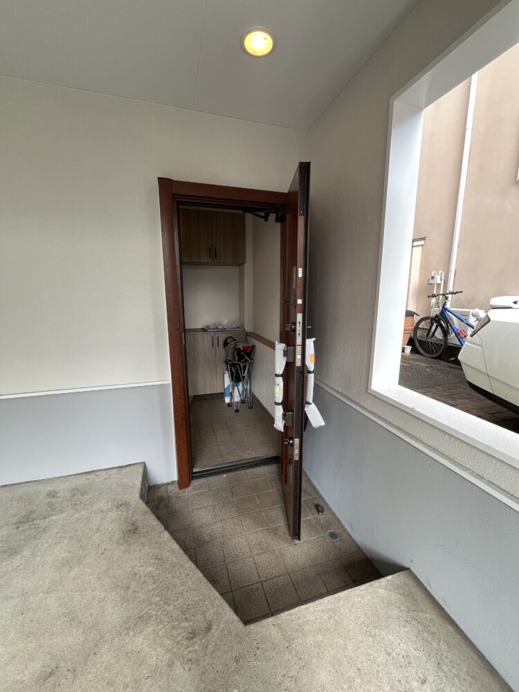 外界の視線を遮り、家族のプライバシーを深める、奥ゆきのある玄関アプローチ。扉はダブルロックです。