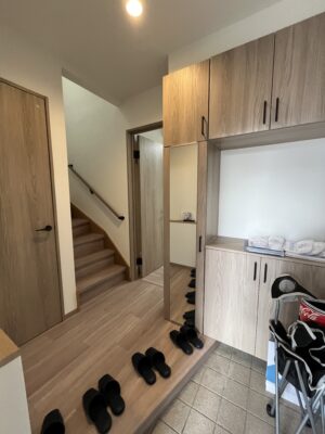 大型のシューズボックスには、お出かけ前のチェックができる姿見鏡付きです。