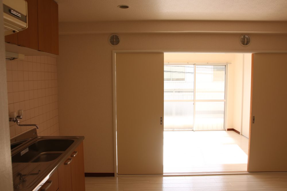 広めの玄関を抜けた先には、広々7畳のダイニングキッチン。さらに、引き戸となっている扉を開くと、日の光が燦々と注ぐ6畳のベッドルームが広がります。それぞれを独立した部屋にするも、開け放して広めの一室として使うも自由♪ 自分好みのレイアウトを楽しめそうです。