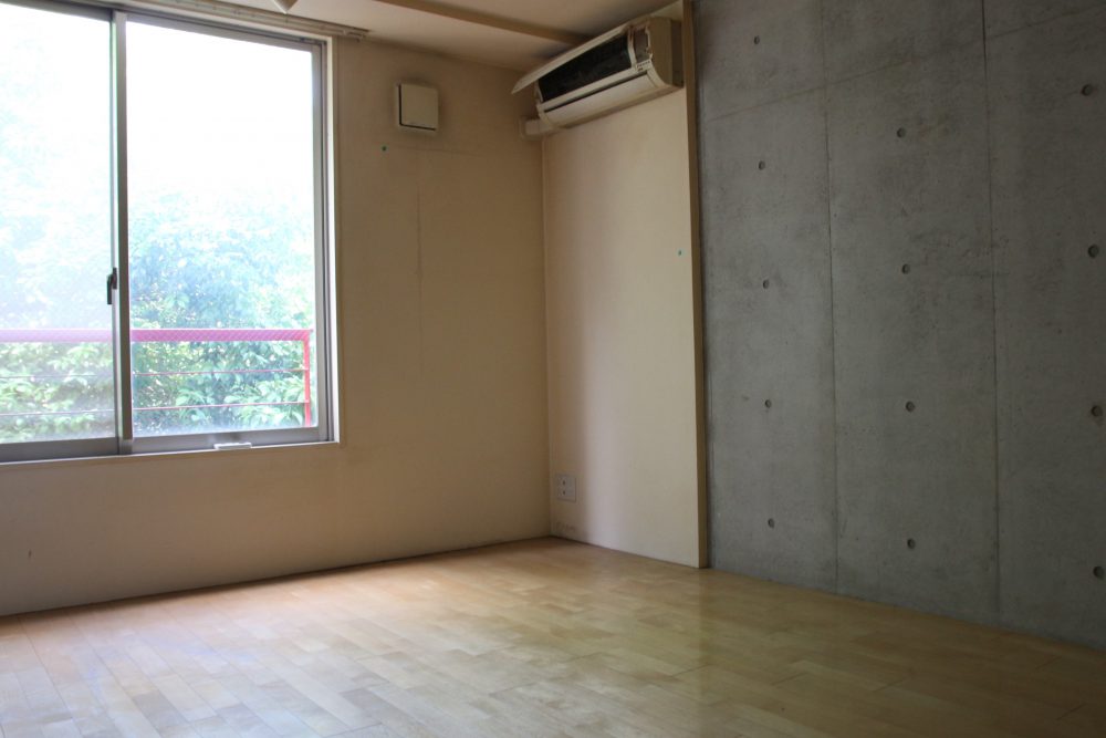居室内もコンクリート打ち付けの壁と赤色の柱、ふたつの部屋を仕切る擦りガラスなど、部屋におしゃれさを求めている人は嬉しくなってしまいそうな、スタイリッシュなデザインです。さらに、2口ガスコンロ付きのシステムキッチンやウォッシュレット、ウォークインクローゼットなど、機能面にも抜かりなし・・!