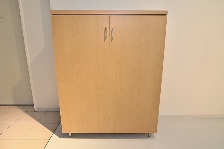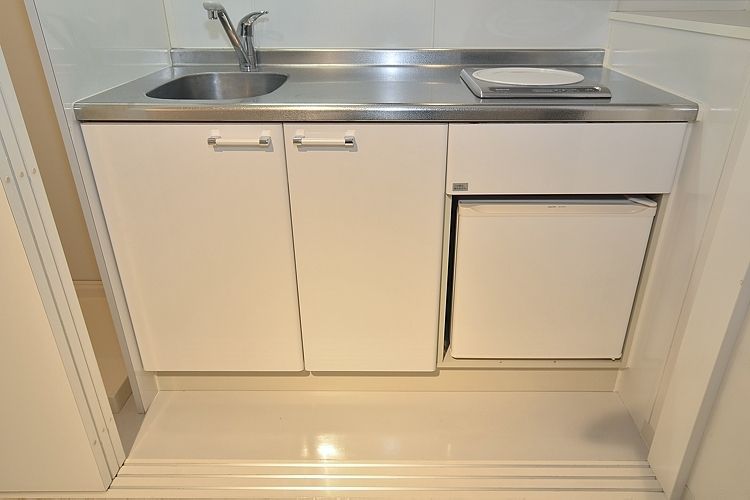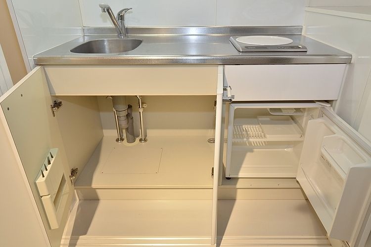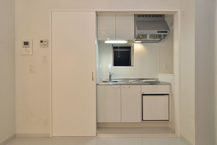 キッチンと洗濯機置場に白い戸が付いています。閉めると、壁と一体となり清潔感ある居室に見えます。 -