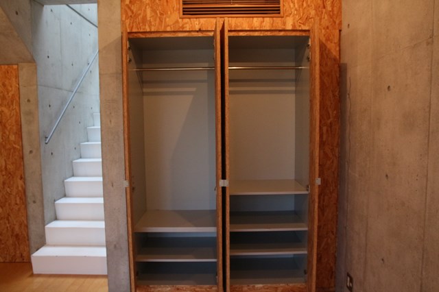 室内はメゾネット式の居室で、コンクリート打ちっぱなしの内壁と、コルク調の差し色が秘密基地のような雰囲気を醸し出しています。