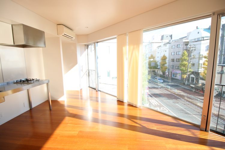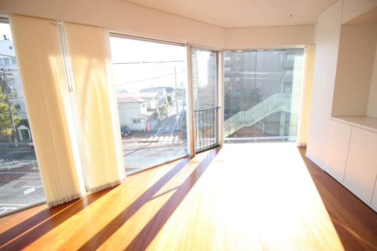 い・・いいなぁ。こんなお部屋・・・。室内に入って思わすそんな一言がこぼれました。”壁一面の窓”に弱いのですが、今回の窓は”壁二面の窓”。日当りは勿論のこと、カーテンを開けっ放しにして眺める事が出来る景色は最高です。嬉しいことにリビング側の窓前は道路で、他の建物が日当りや景観を邪魔することがありません。