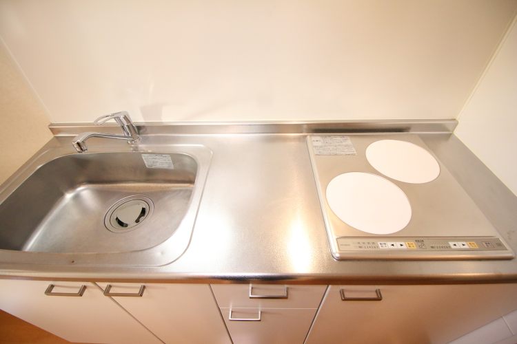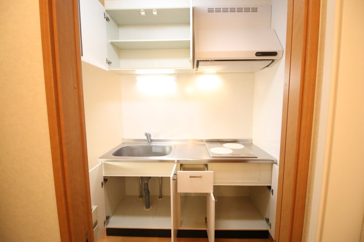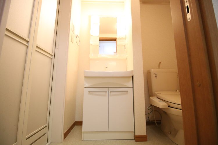 室内はシンプルな1K。よくあるタイプの間取りですが、小さな気遣いがきいたニクいお部屋。扉を開けると、清潔感がある綺麗なお部屋があらわれ、使いやすい間取りの中に2口コンロのキッチン、独立洗面台、ウォシュレット付きのトイレ、浴室乾燥機付きのお風呂が収まっています。トイレにはトイレットペーパーを置ける収納が設けられているのも有り難い。