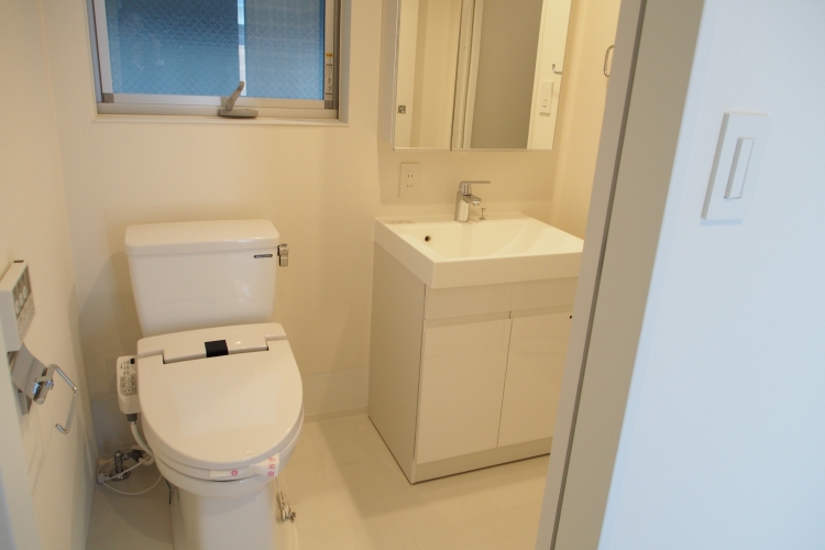 バス・トイレ別、トイレはウォシュレット付きです。鏡の後ろが収納になっている独立洗面台が設置されています。 -