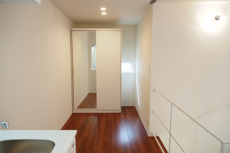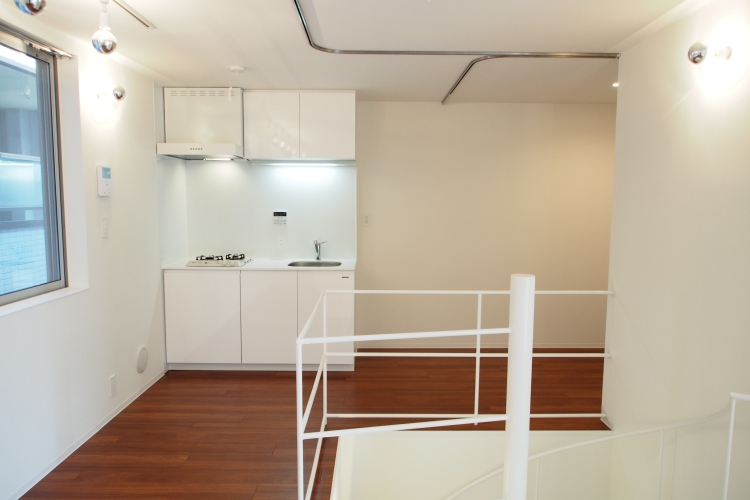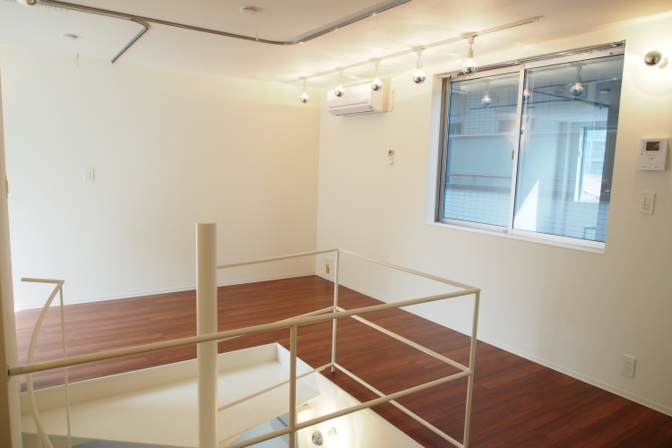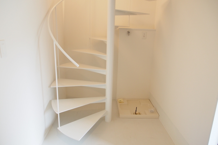 螺旋階段を登ると2階へ。1階に水周りがまとまっており、2階は寝室、リビングダイニングスペースになります。 -